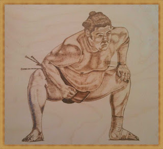 Sumo güreşi öteden beri sempatik bulduğum bir spor dalıdır. Biraz tonlama çalışmam gerektiğini düşünerek bu deseni seçtim.1,2 mm kalınlıklı krom nikel telden yaptığım üç farklı uçla,farklı ısılarda tonlama sonuçlarını gözledim. Ayrı bir uç kullanarak saçlar üzerinde çalıştım. Malzemem yine huş kontraplak. 30 x 33 cm ölçülerinde.